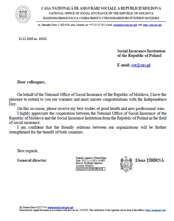 w imieniu Narodowej Kasy Ubezpieczeń Społecznych Republiki Mołdawii mam przyjemność przekazać Państwu nasze najserdeczniejsze gratulacje z okazji Dnia Niepodległości.