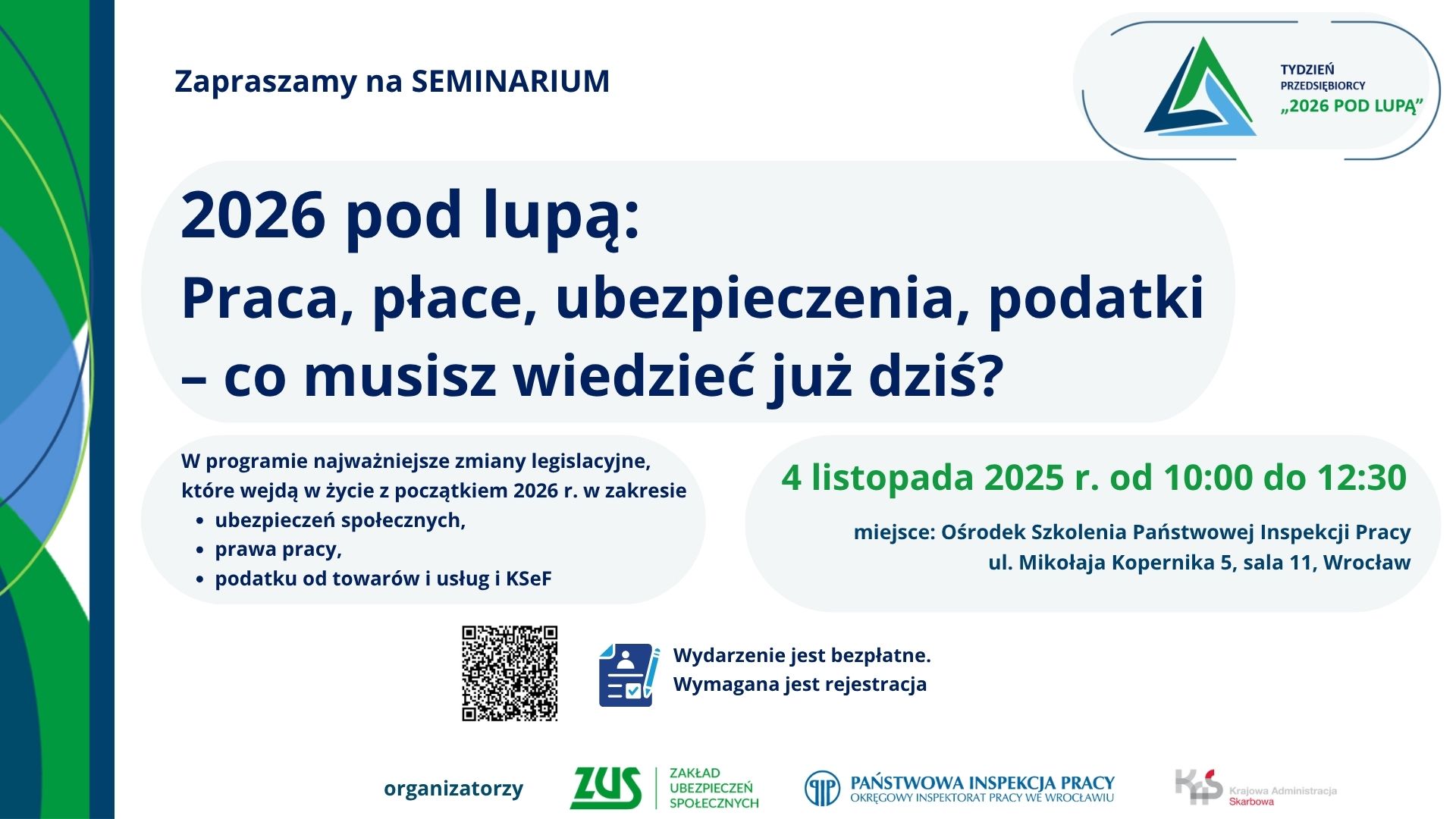 W imieniu organizatorów Zakładu Ubezpieczeń Społecznych Oddział we Wrocławiu, Okręgowego Inspektoratu Pracy we Wrocławiu oraz Krajowej Administracji Skarbowej zapraszamy na Seminarium „2026 pod lupą: Praca, płace, ubezpieczenia, podatki – co musisz wiedzieć już dziś?”.