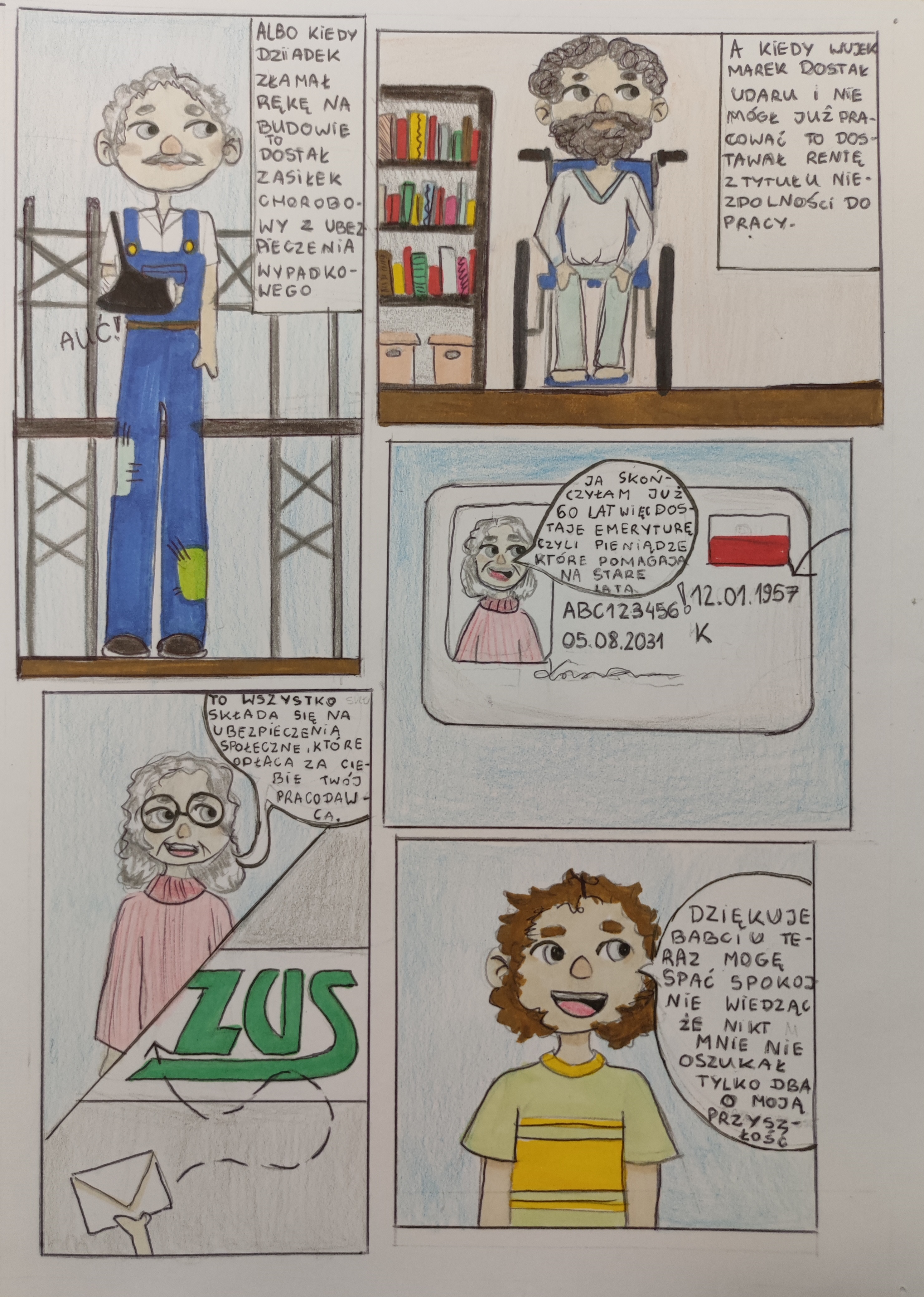 Zadanie konkursowe polegało na wykonaniu plakatu lub komiksu lub nagraniu filmu, który wyjaśnia, jak istotną rolę odgrywają ubezpieczenia społeczne. Po lekcji o ubezpieczeniach młodzi plastycy i filmowcy zmierzyli się z tym tematem samodzielnie, w parach lub małych grupach.