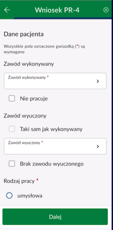 Na kolejnych stronach wybierz zawód i rodzaj pracy pacjenta oraz jego choroby współistniejące