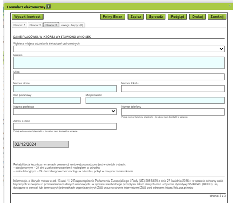 Na kolejnej stronie uzupełnią się dane placówki medycznej, z której wystawiasz wniosek. Możesz dołączyć dokumentację medyczną pacjenta.